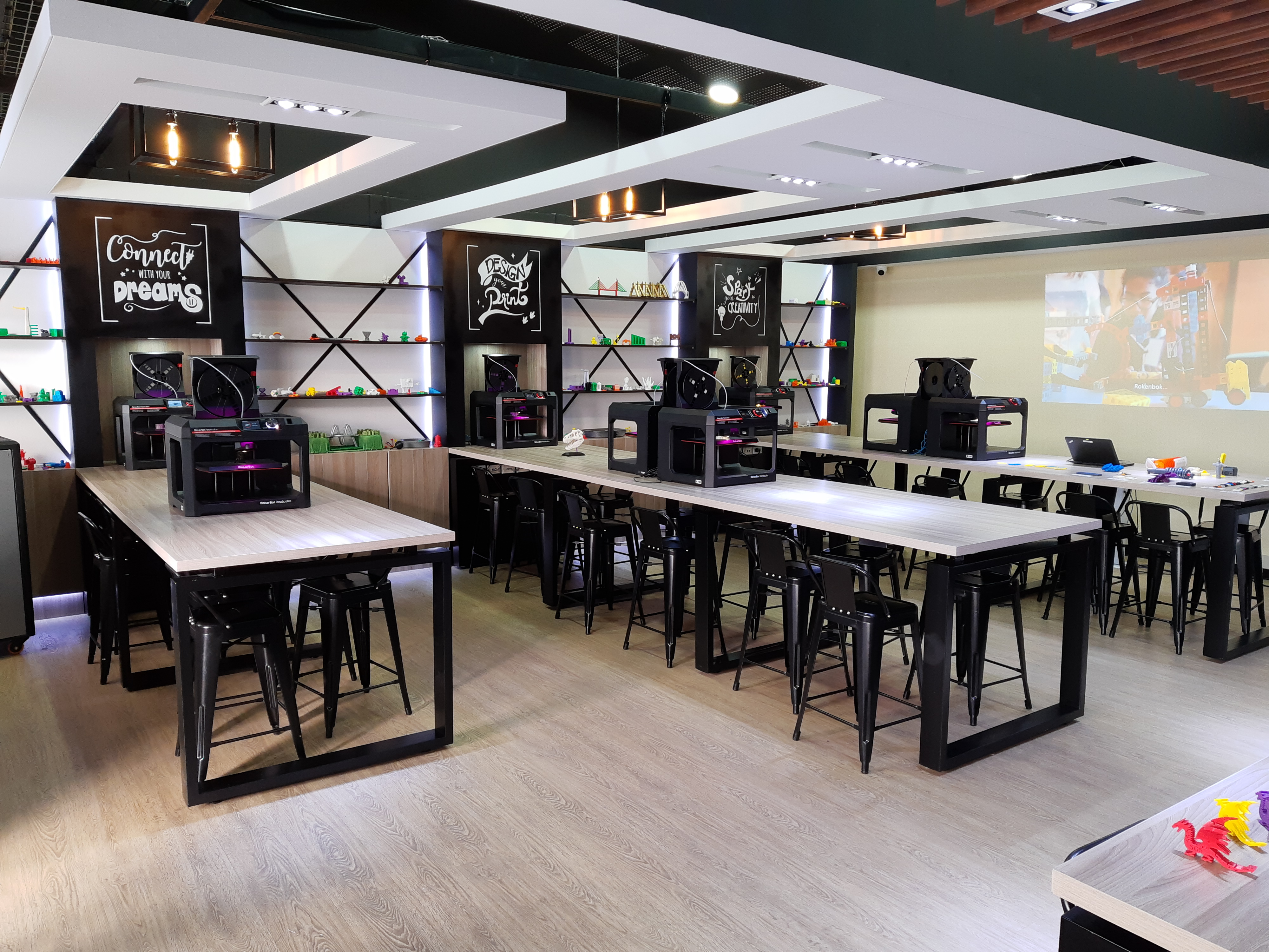 La solución se conformó en un principio por 10 impresoras Makerbot (replicator+), las aplicaciones de diseño y el acompañamiento de un monitor para capacitación y soporte técnico. Posteriormente, adicionamos el proyector de imágenes y un scanner de objetos 3D.