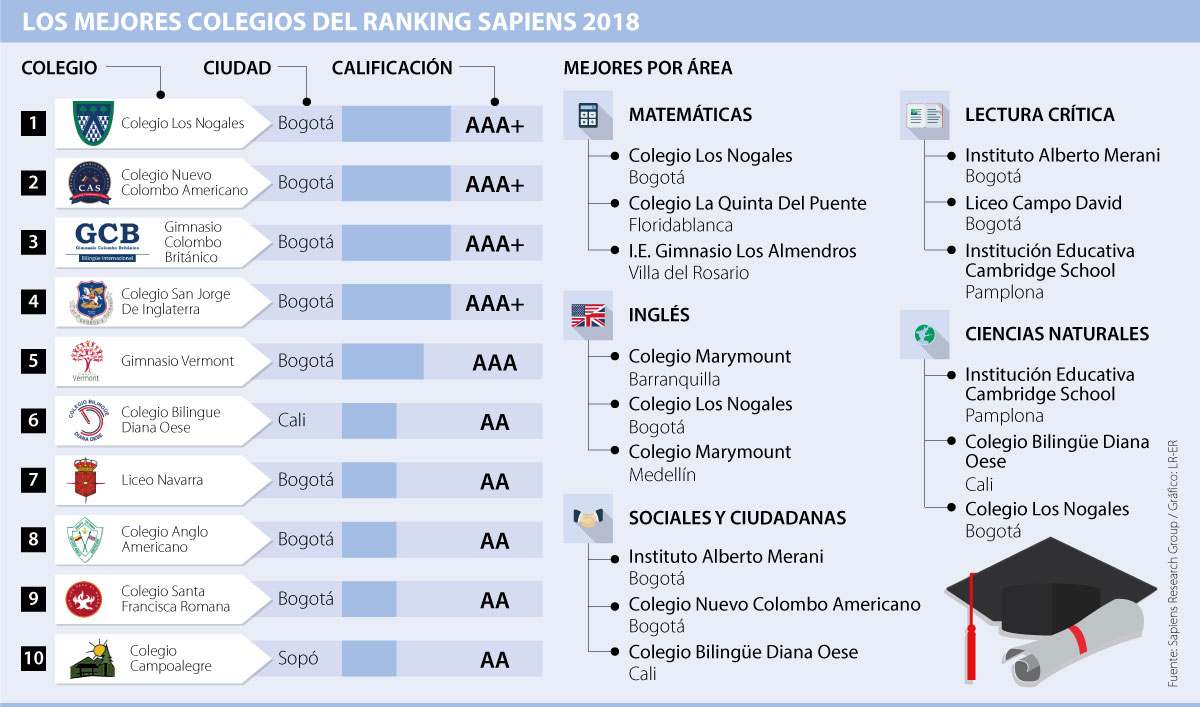Sapiens Research Group es una firma de consultoría con más de 15 años de experiencia, ha publicado diferentes estudios y clasificaciones a partir del análisis en educación e investigación. Carlos Peña director de la organización, afirma que “estos listados resaltan la calidad y prácticas de excelencia que aplica cada colegio para que sus estudiantes alcancen niveles tan altos de desempeño y esto aporta como incentivo y reconocimiento para el plantel” (Diario La República)
